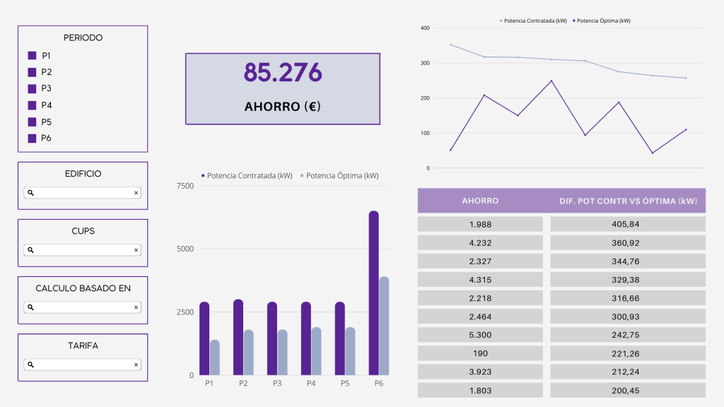 A través de un Dashboard esta información es agregada, permitiendo evaluar de forma global el potencial de ahorro de una organización, segmentar oportunidades de ahorro, así aquí priorizar las gestiones de cambio de contrato.